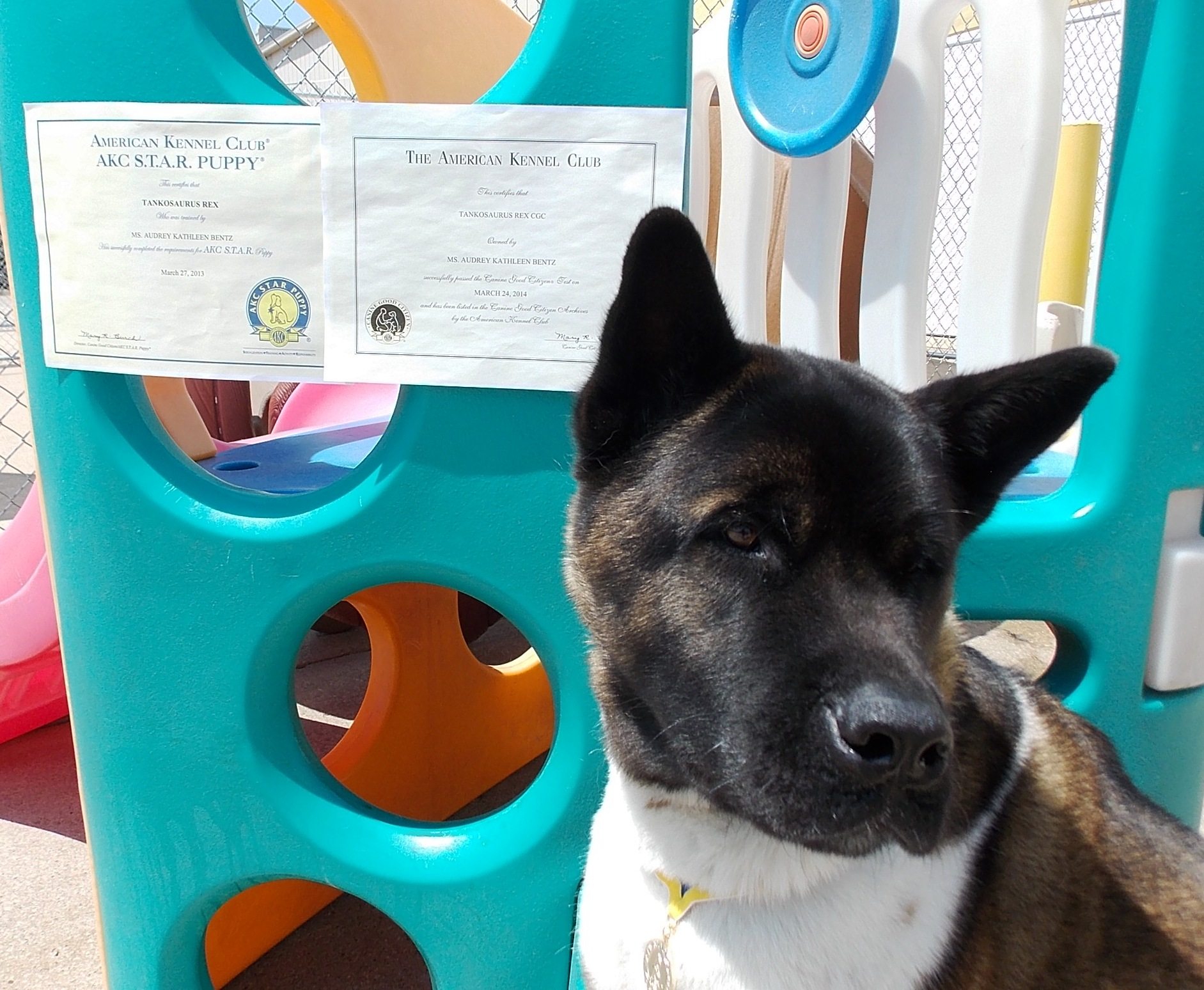 Tank is pictured with his S.T.A.R. Puppy and CGC title Certificates. This AKC certification acknowledges that all dogs deserve training and a responsible owner and the goal is to reward responsible dog ownership. This certification is a natural lead in to the AKC® Canine Good Citizen® Program. Started in 1989, the CGC Program is designed to reward dogs that have good manners at home and in the community. Tank has demonstrated he has both.