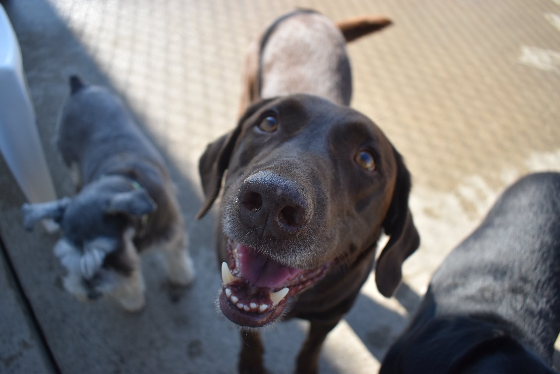 July’s Dog of The Month, Rocky the Chocolate Lab, is a playgroup veteran. At ten years old, his smile and cheerful trot still brighten up the day. Rocky’s even kind to our groomer, Julie. He readily gets into the tub when it’s bath time and doesn’t flinch at a nail trim. Please join us in congratulating Rocky, our extra good boy July Dog of The Month!