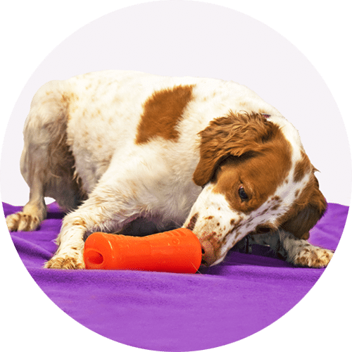 During one of your dog’s rest periods throughout the day, they are offered a rest period enrichment activity to stimulate their mind while encouraging healthy rest. These licking and chewing activities involve food rewards, such as frozen peanut butter KONG®. These activities engage their minds while helping foster quality rest.