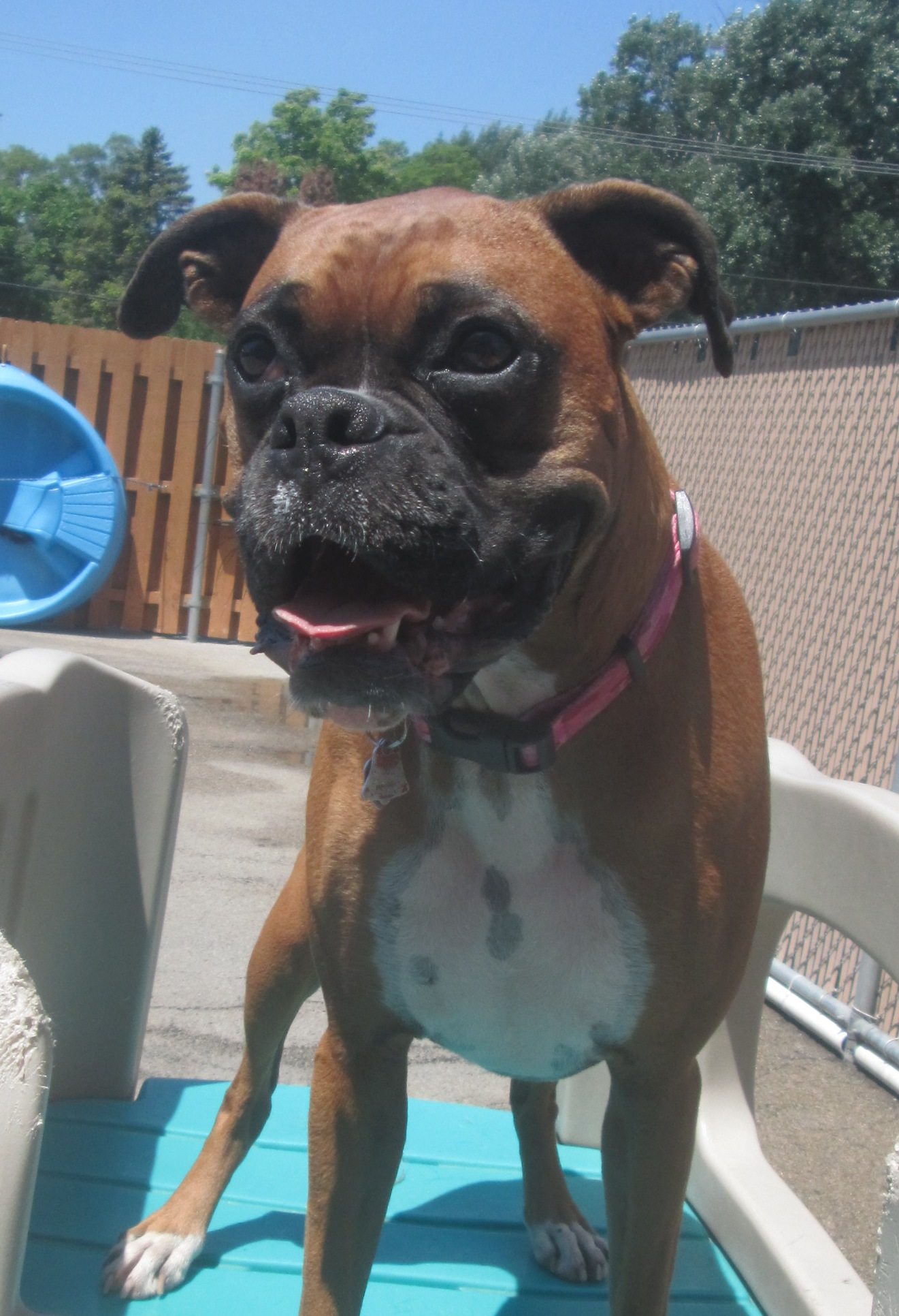 Meet Bobi! Bobi is a beautiful three year old boxer who has been coming to Central Bark since December 2010. Bobi’s happy disposition will put anyone in a good mood! She LOVES mixing it up with her fellow boxers but has no problem showing a lab a thing or two! Below are some fun antidotes about Bobi: – Bobi is the social media director and activities coordinator of the “Grayslake Boxer Crew.” – Her favorite R&B singer is “Bobi Brown.” – Her favorite chewing gum is “Bobilicious” – Bobi’s favorite instrument to play is the fiddle; which she plays every Tuesday night at the Senior Center during Bingo Hour. – She prefers pink collars to match her eyelids. – Bobi always has an ample supply of napkins which she passes out to the other boxers prior to lunch. [it’s a boxer thing] – If she was a Star Wars character, her name would be “Bobi Wan Kenobi.” – If she was a Lord of the Rings character, her name would be “Bil-Bobi.” – In her spare time, she likes to cruise around in her clown car with eight other boxer buddies. – Her favorite sport is “Bob-ing for Apples” for money. – Bobi becomes extremely frustrated when her name is mispronounced… “it’s BO-Bee… not BOO-Bee!” Congrats Miss July! Hope you have a BO-dacious summer!