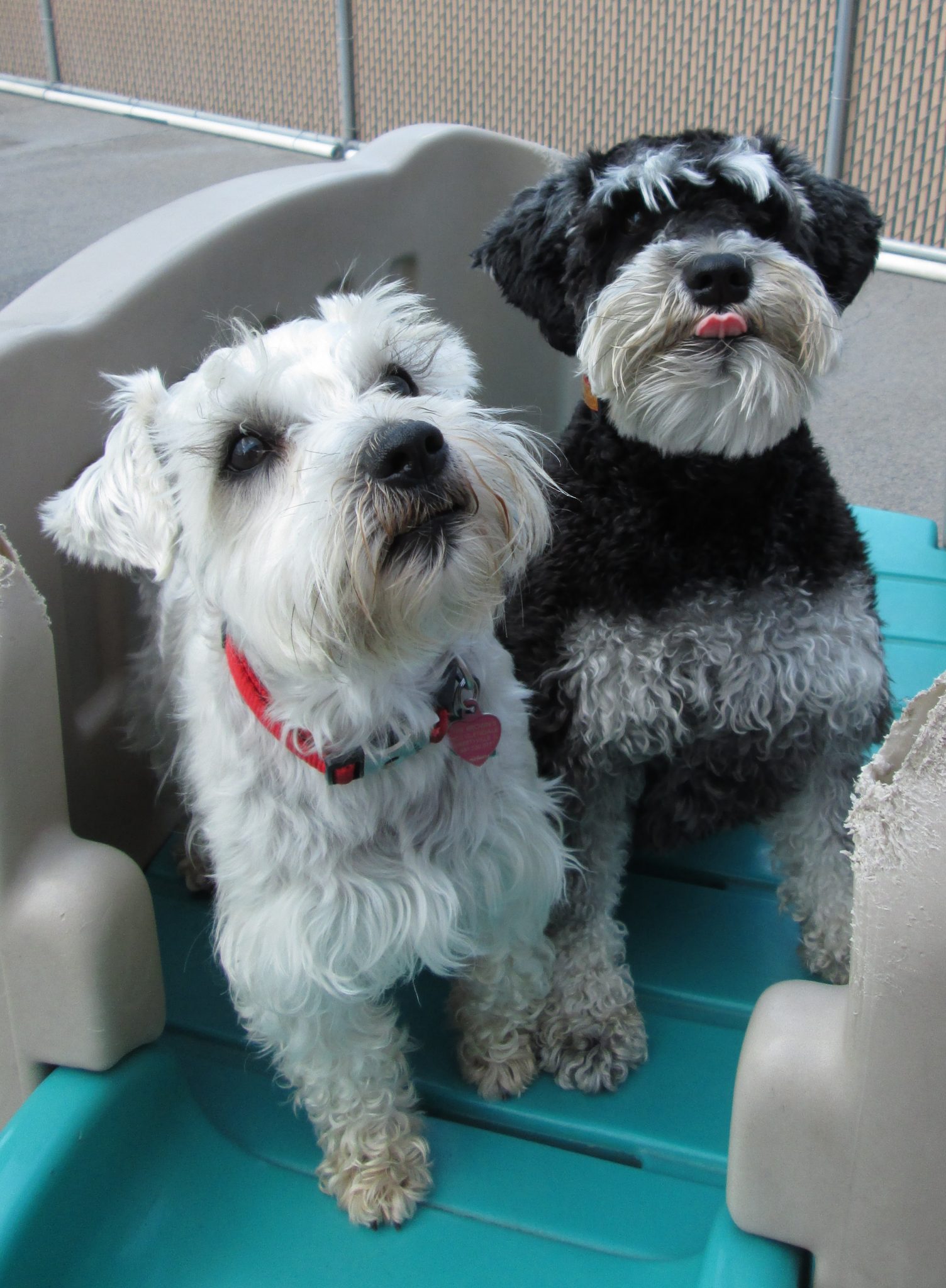 Once upon a time (January 11, 2011 to be exact), a beautiful young schnauzer named Rue Bea started to come to Central Bark. She was a feisty girl who loved to chase and play with all of her fellow furry friends. Rue Bea came in two to three times a week, loving every moment and then one day, everything changed. It was a typical fun spring morning and as all the dogs were entering the playgroup for morning play, a lone schnauzer figure came out of the shadows. His name was Pepper, and he was our new foster. As Rue Bea’s and Pepper’s eyes met for the first time there was instant chemistry. After the initial butt sniffs were over, there was no turning back… these two were inseparable! That night, Rue Bea went home and told her mommy all about the boy she met and how he is available for adoption. She continued to tell mom over and over and over again until mommy agreed to meet him. The rest is history. Since then, Rue Bea and Pepper’s relationship has blossomed into brother and sister. Every once in awhile there will be some sibling rivalry between the two… whether it be who gets through the door first, whose turn it is to play with the new kid or whose turn it is for some TLC! No worries though, they always make up and never leave Central Bark angry! These two schnauzers are full of pep and spirit. Their big brown eyes melt our hearts every time and Pepper’s whispery bark (or lack thereof) always brings a smile to our lips. Congratulations Mr. and Mrs. August 2012!