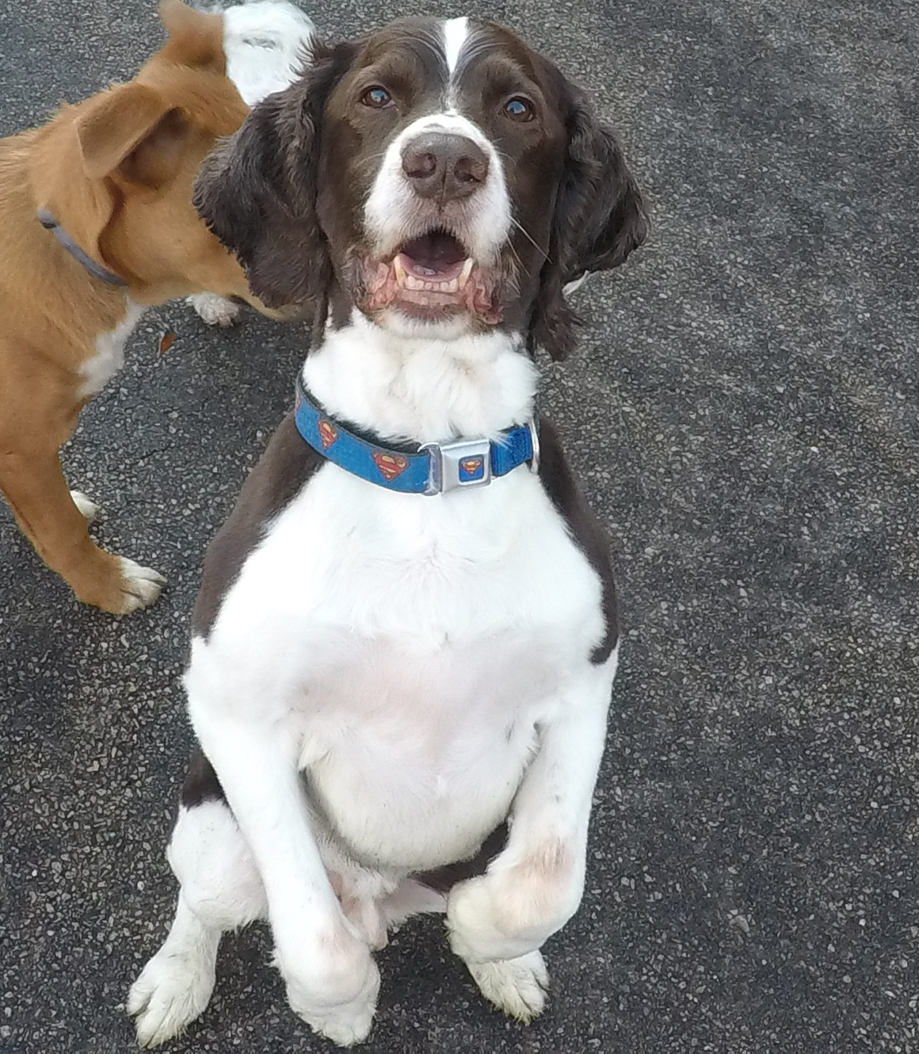 Bailey is an almost 8 year old English Springer Spaniel who has been coming to the Bark since January of last year. Bailey is a fun-loving dog who really enjoys coming to daycare. He loves to play with toys and chase the laser pointer. We know Spring is on the way because yesterday Bailey was playing another of his favorite games—chasing the birds! Bailey also loves doing tricks like “speaking” and sitting pretty like he’s doing in the picture here. Bailey can be a little picky about who he likes to play with (his best friends are Homer, Moco and Jupiter), but he’s good natured about letting everyone kiss him when he comes in in the morning. He is well-behaved at the gate and in the crate. Bailey is such an easygoing guy and we’re glad to have him at the Bark. Congratulations Bailey!