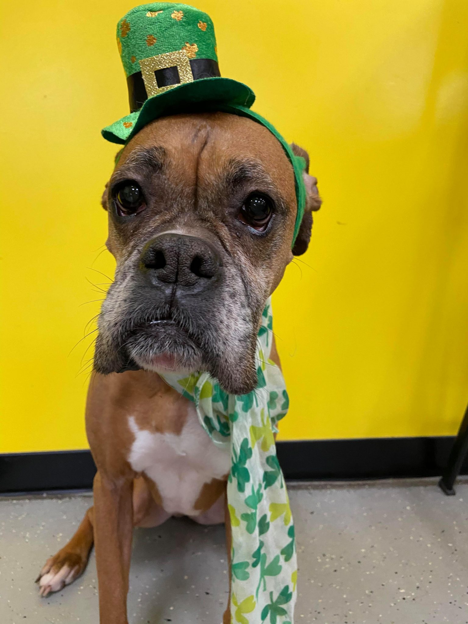 This month’s lucky Leprechaun is Sophie! This wiggley boxer made her way to the pot of gold at the end of the rainbow. Sophie has been coming to daycare for a few years now. Sophie will be throwing a party with her best buddies; Otis, Chloe, Macy, and her new favorite puppy Bella the boxer! We enjoy our time with Sophie and all that boxer sass! Thank you to her parents for bringing her! We can’t wait to make more memories with her!
