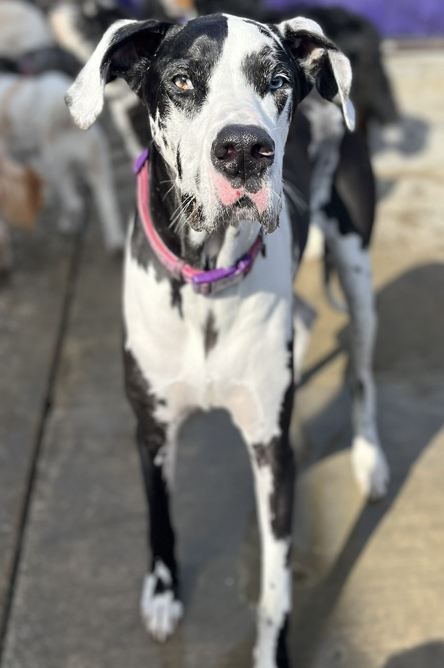 Inside every big dog there’s still a puppy that wants a hug. Dax, a gorgeous black and white Great Dane, and our April Dog of the Month, is happy to start her debut each visit with a big hug from our staff before she makes her way back to socialize with her play group of four legged friends! Dax joined our program as a sweet young pup of only a few months old and is now six! She is not just a pretty face mind you; her mind is very sharp. She is so smart, in fact, that if you take the camera out in an attempt to capture her beauty, she easily turns her head away, managing to nearly always thwart us! She does, however, enjoy basking in the warmth of the sun, so that is when we sneak in to snag our pictures! Dax has made many friends over her many years with us, some of her besties are Stella, Sully, Millie, and Henry. When she is not bounding around with her pals, or basking in the sun, she enjoys leaning against her human friends and getting a little extra attention. We affectionately call her a ‘leaner’ as she gets so relaxed that she sometimes nearly pushes us over! Dax we simply adore you and are so proud to have been a part of caring for you as you grew from an energetic whippersnapper into the amazing lady you are today. Thanks for being a part of the Central Bark family! Our program wouldn’t be the same without you! Enjoy your month in the spotlight and show you off as the star you are!