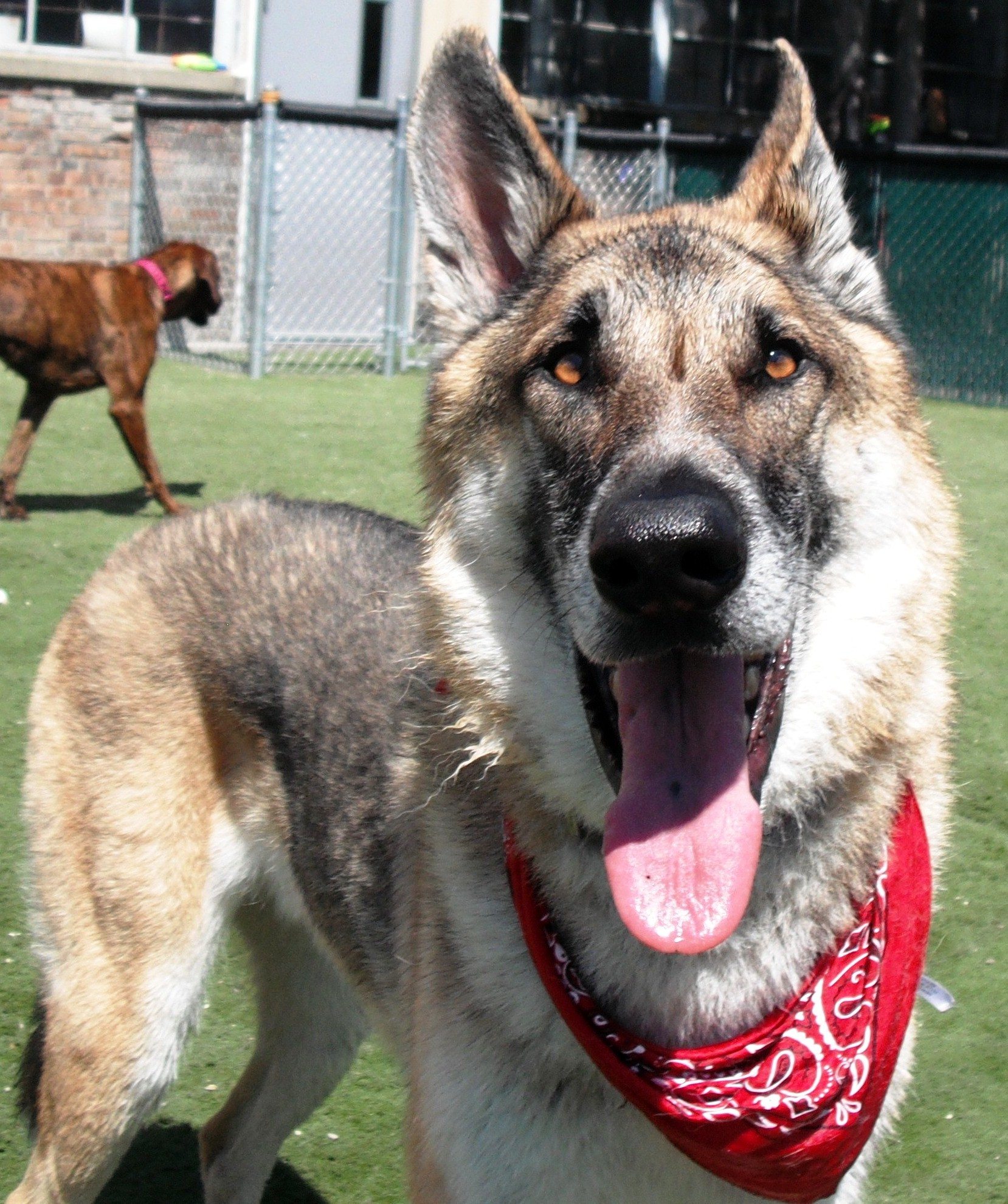 Central Bark Downtown would like to introduce you to one of the kings of our pack: the Mighty Hogan! Tall and lanky, some may say he moonlights as the Wile E. Coyote, or Big Bad Wolf from Red Riding Hood as he so famously depicted during our Halloween costume contest this year. But, the staff at Downtown knows his true and favorite pastime: instigating the best games of chase and tag with the handlers in his group! Just when you least expect it, Hogan loves to gain your attention by a nudge on your back or a tug at your hand. When you ask him, “What?” he, “Arr roo roo roo’s” back at you; his regular ole’ command of: “Hey, let’s go and play! You aren’t busy enough!” It’s hard to not oblige him, as he always happens to have a big, goofy grin on his face and the best play bow around. After several laps around group, Hogan sticks to your side, acting as your shadow and master overseer of the dogs until the ga me of chase with the handler starts again, or one of his canine buddies rile him up for a good wrestle on the turf. Big or small, Hogan plays well with all kinds of dogs, though a special place in his heart belongs to all Mastiffs—his absolute favorite. This big guy can be a bit sneaky, especially when coming inside for naptime. If Hogan smells food or a treat, you can bet your dog bones that he is trying to swipe some for himself. Our favorite is when he helps himself to the birthday treats on the front counter at the end of the night. His act of innocent sniffing often has us fooled, until he opens his big chompers and tries to gulp down as many treats as possible before mom can pull him away. Free spirited, with a mind of his own, and always making us laugh, there is a reason why Hogan is a dog that we greatly look forward to seeing every week. We love this handsome devil to death, and are so happy to be able to spend time with him! Congratulations, Hogan! You are Central Bark Downtown’s January 2013 Dog of the Month!