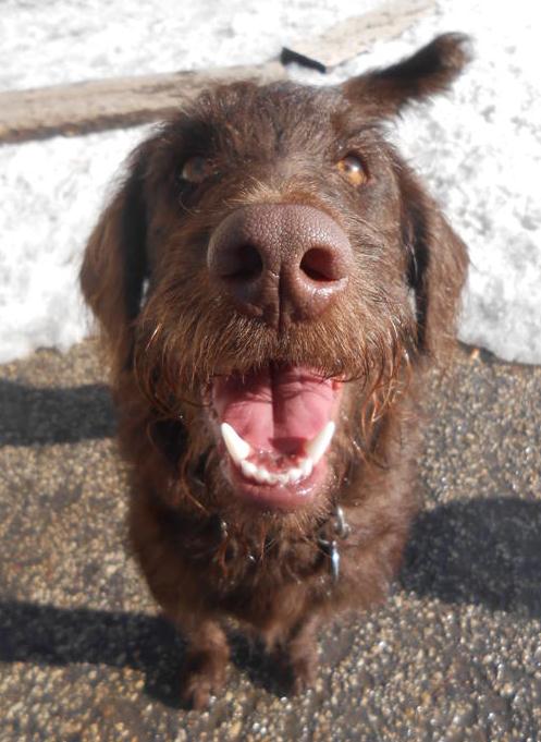 Meet Lady, a force to be reckoned with! Not yet a year old, this pint size, petite, Lab/Poodle is a powerhouse of a player and loves nothing more than to play, play, play her day away for hours and hours on end 5 days a week. Dancing her way in each morning, usually on her 2 back legs, she never appears to be tired from her activities the day before. While the name Lady may suggest a delicate, demure nature, this little gal is certainly not your average “lady”. Tough as nails and rough and tumble is more her style-dogs need to have a high stamina to be able to keep up with her energy level. She reminds us of a ride at the carnival that goes around and around and around…except that it never stops and no one gets off until she says so. Her carefree spirit, “Where’s The Party” attitude, along with her friendly smile, make her the kind of dog that everyone wants to be friends with. Indeed, she can be seen in the company of some of her best buddies Fermi, Ollie, Zoe or Earl on any given day. When she isn’t enjoying her time romping with her pals, some of her favorite pastimes include, chewing leashes in half, destroying toys and devouring socks. While she finds these activities a lot more fun than her parents do, they cannot help but love her despite her odd tastes for nylon, rubber and cotton. She is just too darn adorable. We agree. All hail our April Dog of the Month and official “Bearded Lady” resident, Lady!
