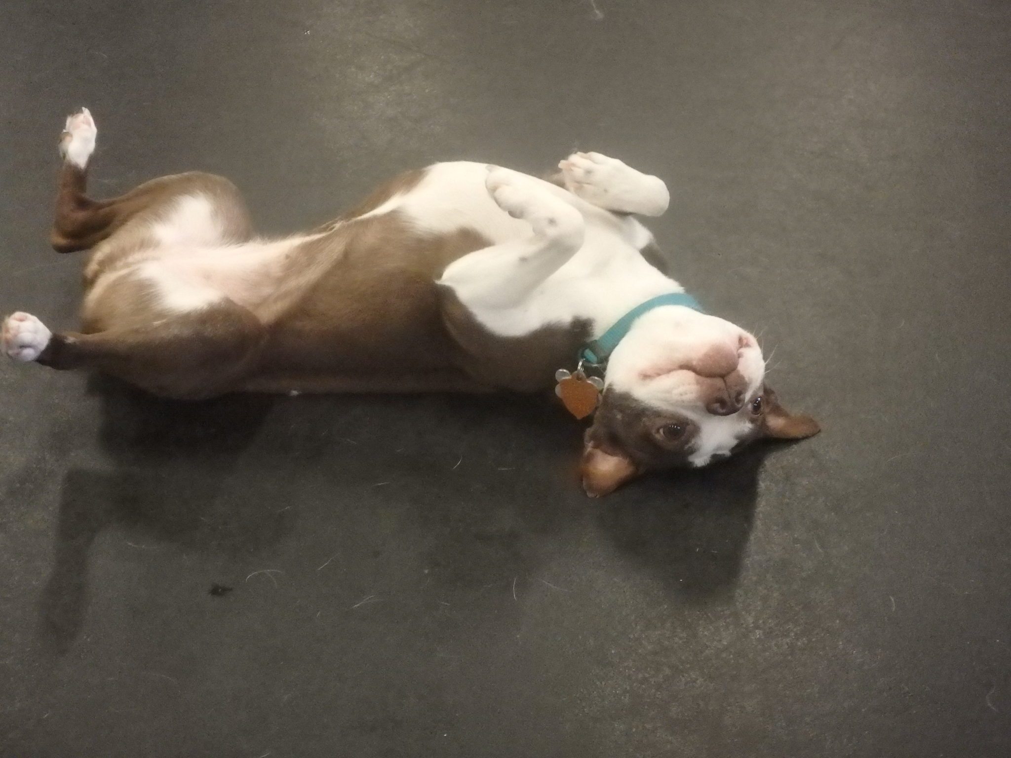 The snow’s melting, the sun’s coming out, and here at the Eastside we have the perfect dog to put a little spring in your step! Please give a howly congratulations to Ms. Bella the Boston, Eastside’s March Dog of the Month! Bella lady has been making us feel lucky for over 3 years now; the middle of our week wouldn’t be so chipper without this bouncy lady! Some of her favorite pals include some smooshy faced friends like Chewie, Eddie, and Irma, as well as all our new puppy friends like Pepper, Louis, and Blaze! She keeps group one active, whether by leading entire-group games of chase, riling up the puppies, Teaching us to get some perspective, Bella Boston can be happily found in variety of goofy positions when it’s time for this little leprechaun to catch some zzzs! Lunch time is easily her favorite part of the day, the excitement of the crate room, the smell of freshly cracked wet food, and treats in a Costco sized jug, what could be better? She’ll trade you snuggles for her kibble if you’re lucky! There’s nothing like finding gold at the end of the rainbow, but here at Central Bark, we’ve found something even better: March 2018’s Dog of the Month, Bella!