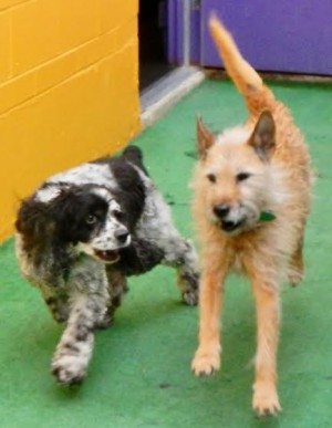 We would like to introduce one of the coolest pairs of dogs around: Rocky and Tulip! These two casual canines have happily been coming to day care since 2005, and still can’t seem to get enough. Rocky loves to show off his flashy, black-and-white-spotted coat! This 12-year-old Cocker Spaniel has a great set of buddies here: from Ranger, to Bella, to Issac. Fetch, pets, and sunbathing are always top on Rocky’s to-do list. His most important daily activity? Keeping watch over his little sister! Tulip is a 10-year-old Terrier mix, and boy does she LOVE to talk! Every morning Tulip announces her presence as she walks through the door with her classic “arr-arr-arr!” as she happily settles in. Once out in group, where there’s a Tulip, you’ll find a Rocky nearby. Tulip enjoys a more delicate lifestyle: basking in the sun, massages from the handlers, and sniffing her buddies are always a normal occurrence! From day car e to weekend sleepovers, Rocky and Tulip love spending their time at Central Bark Northside. Congratulations to our June 2014 dogs of the month: Rocky and Tulip! Woof!