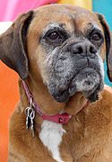 There may be grey on the muzzle but there is plenty of play left in this girl. Ellie particularly likes to watch over the puppies to make sure that they are being appropriate, maybe because she was a mom herself once upon a time. But she takes time to play with dogs her own size. The handlers appreciate having her in the playgroups. Ellie was adopted from Green Acres Boxer Rescue and is one of their “calendar girls” to help promote Boxer adoption. Thanks, Ellie, for showing us what it means to grey gracefully.