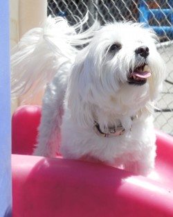 This cutie is Riesling (yes, like the delicious German wine!). She is full of play and can be a little sassy! She likes her stuffed toys, which she likes to unstuff! She turns 6 years old this month but maintains her puppy antics. Riesling started here in the fall of 2011. Some days she is fully engaged with the pack and other days she gets to hang out with a small group of special friends. Congratulations, Riesling, for being Oak Creek’s June Dog of the Month!