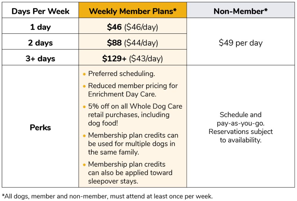 Like so many businesses, our operating costs continue to climb, but we will never sacrifice on the care for your dogs. While our pricing will be adjusted slightly, members will always receive the lowest rates depending on how often you come, just like in our old pricing structure. Pricing options and member perks are listed in the chart below.