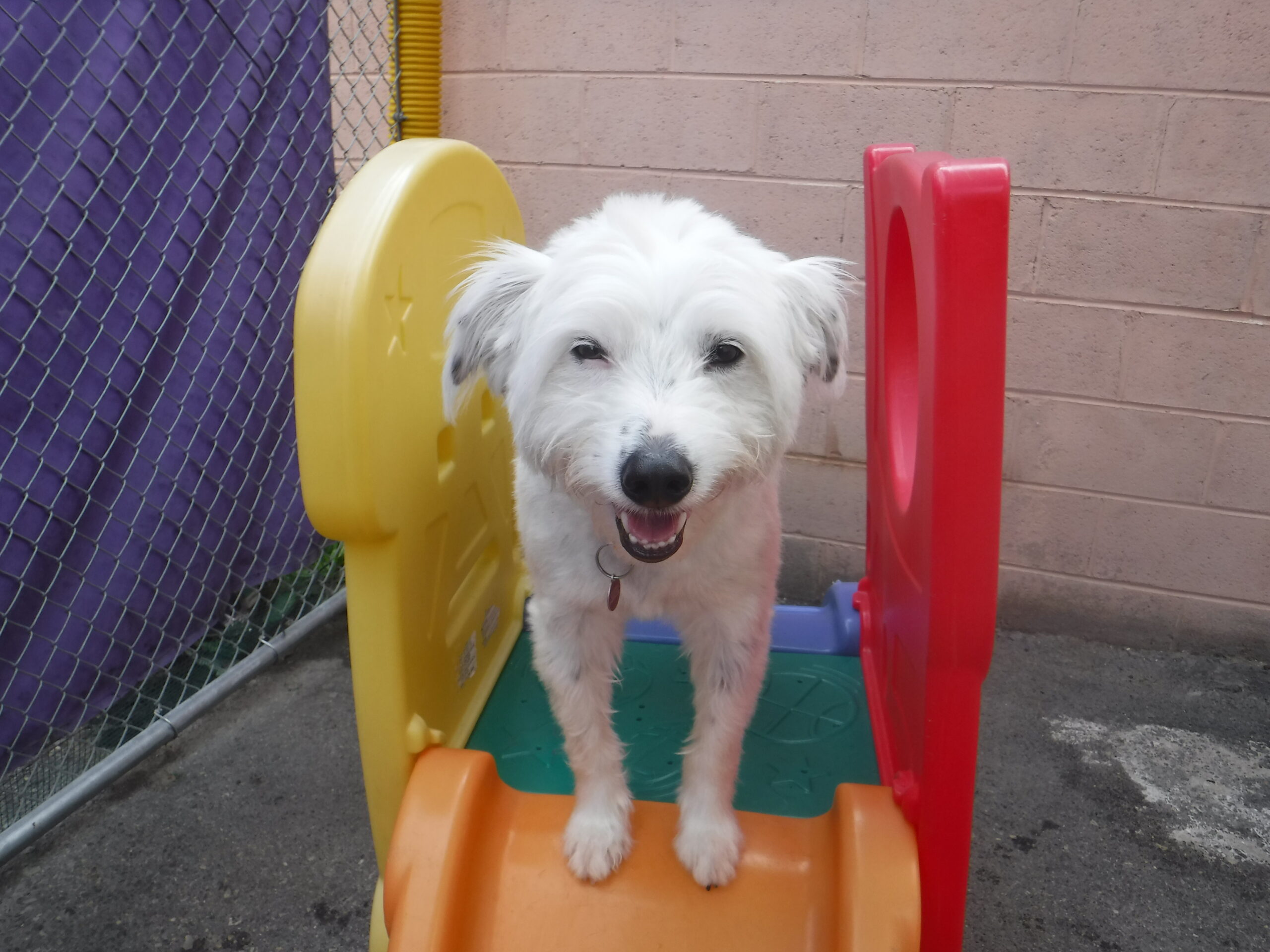 Amba is the sweetest 4-year-old Jack Russell Terrier Mix!! Amba loves everyone humans and dogs she either wants to snuggle or play with her buds. Something unique about Amba is that during Winter she is this big white fluff ball with a few black spots but come Summer and she gets her fresh cut these black spots are all over. If Amba isn’t out back sun bathing as usual that means she took some time to kick back with Rain, Jack. S or anyone that was down to play. We love having Amba join us for daycare she always brightens up the day with her little smile she is just so happy to be here with us.