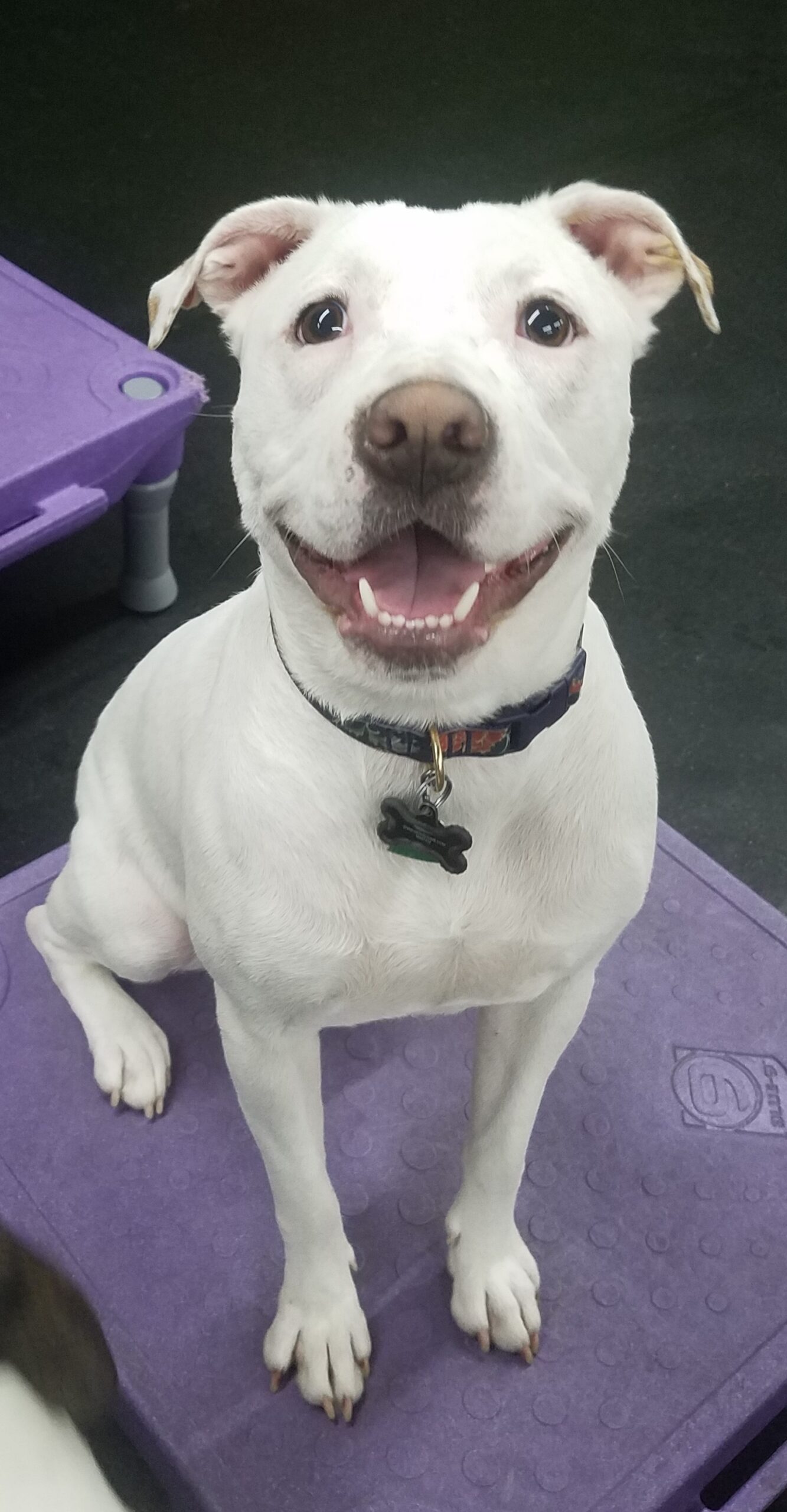 Lucy is a 1-year old Pitbull Mix who has been attending daycare with us for a little less then a year. But in that time, we’ve come to love and enjoy her goofy antics. She has such an amazing personality and is just so happy and wiggly and she just makes everyone laugh. If Lucy isn’t by your side begging for a treat, then you’ll find her playing with her pals Lucy. R, Luna.