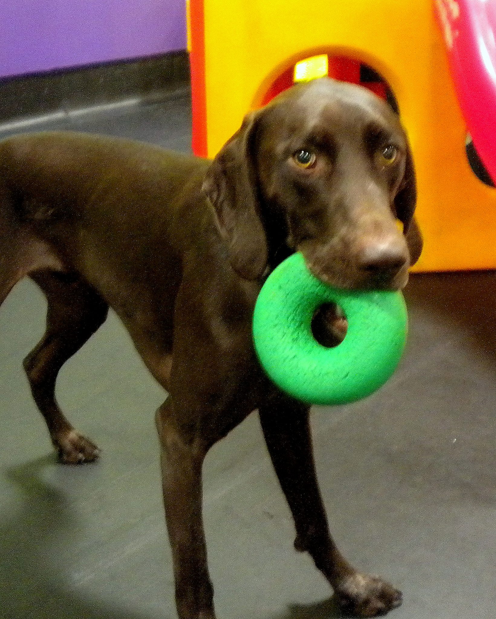 A playful two and a half year old German Shorthair Pointer has taken the spotlight this month. His energetic, but always gentle play has made him shine in our eyes. Kody is brimming with wisdom and charm. Canine caregivers cannot resist petting him while he is leaning against their leg while in play group. Kody has a five year old brother, Remy, who he enjoys playing tug of war with using the Goughnuts. Kody loves to run around during playtime teasing his friends with the Goughnuts, but never actually letting his friends take his toy. Kody enjoys spending overnights with us because he knows another exciting and fun filled day is about to pursue.
