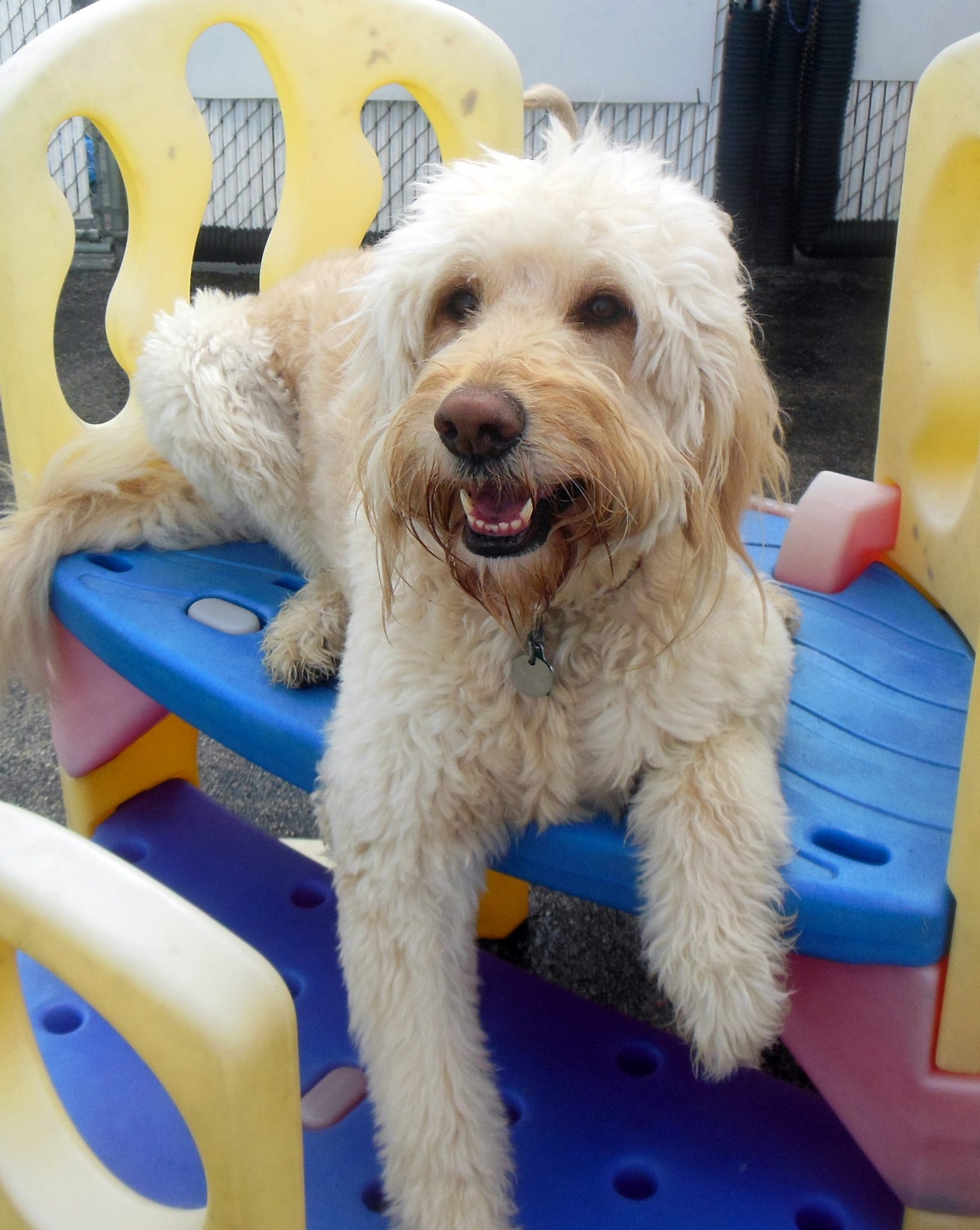 Maggie Mae, a sweet three year old Goldendoodle, is our September Dog of the Month. All of our canine kids have unique personalities and that is certainly true of Maggie Mae. She is fascinated with reaching out with her paw to gently pet another dog as though she is telling them, “relax, rest for a while.” Of course, she also enjoys playing with the toys, especially the Goughnuts, and playing with her best friend, Reilly, another Goldendoodle. Maggie Mae loves attention from the canine caregiver in group and we all enjoy spending time with her. Enjoy the spotlight Maggie Mae! You are a very special girl!