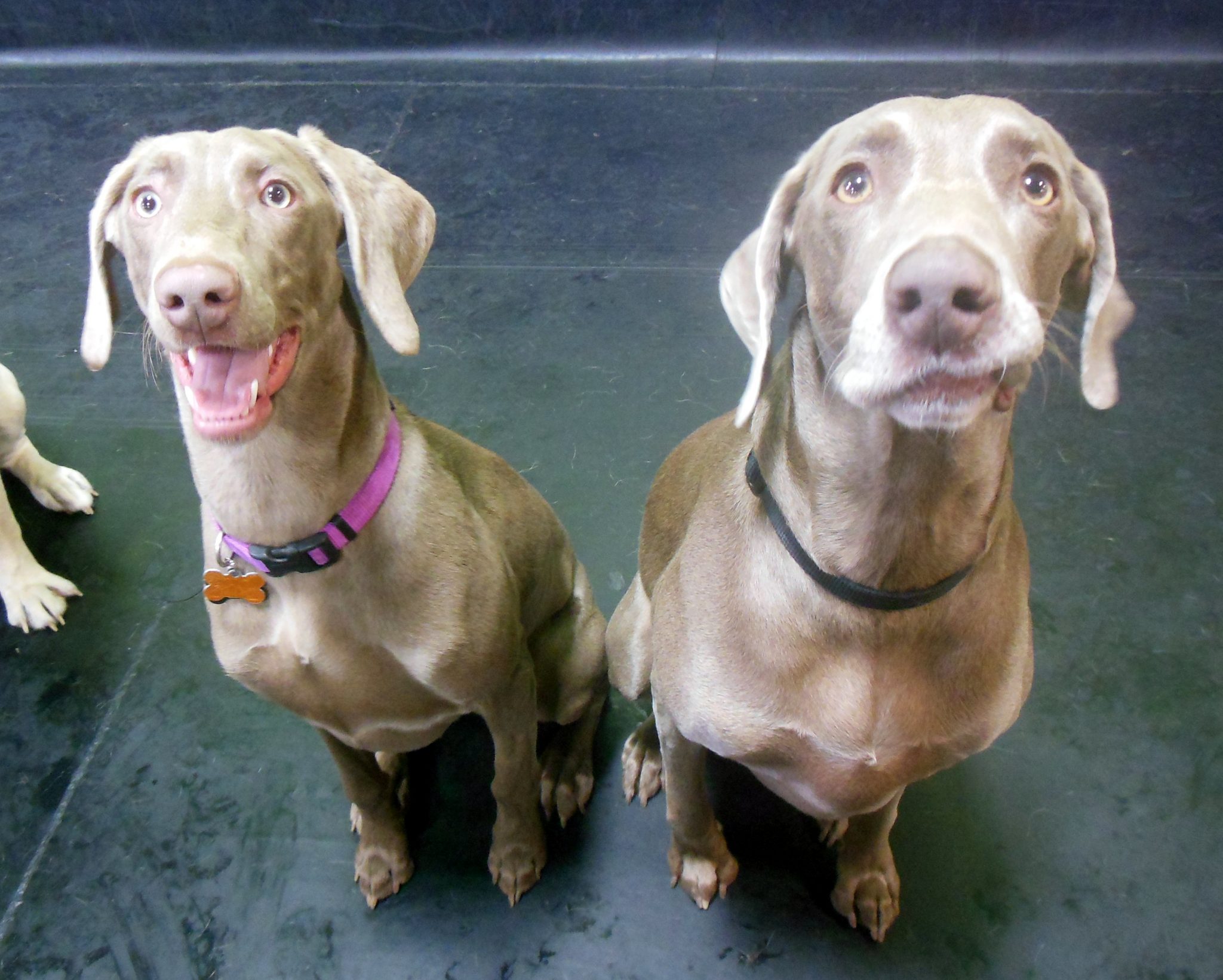 Five year old Morgan and her little sister, 9 month old London, both Weimaraners are spotlighted as our Dogs of the Month for February. February, the month that focuses on Love, is the perfect time to talk about sisterly love. Morgan was an only doggy child for years and then, Mom and Dad brought home her puppy sister, London. Morgan wasn’t thrilled to share Mom and Dad’s attention with this new little interloper. Of course, London loved Morgan from the beginning. She wanted to play with her and followed her around, jumping at her which really annoyed Morgan. Interestingly, when London started coming to doggy day care, Morgan watched over her. Morgan was still annoyed when London was in her face and jumping at her, but she watched over her none the less. When Mom and Dad went on vacation, Morgan and London stayed together in the same kennel unit and were happy to be together. They are the perfect example of the love/hate relationship that doggy sisters and human sisters can have. When it comes right down to it, they are family. I bet you can tell who is who in the photo! Aren’t they an awesome pair? We feel blessed to be able to be part of their lives.