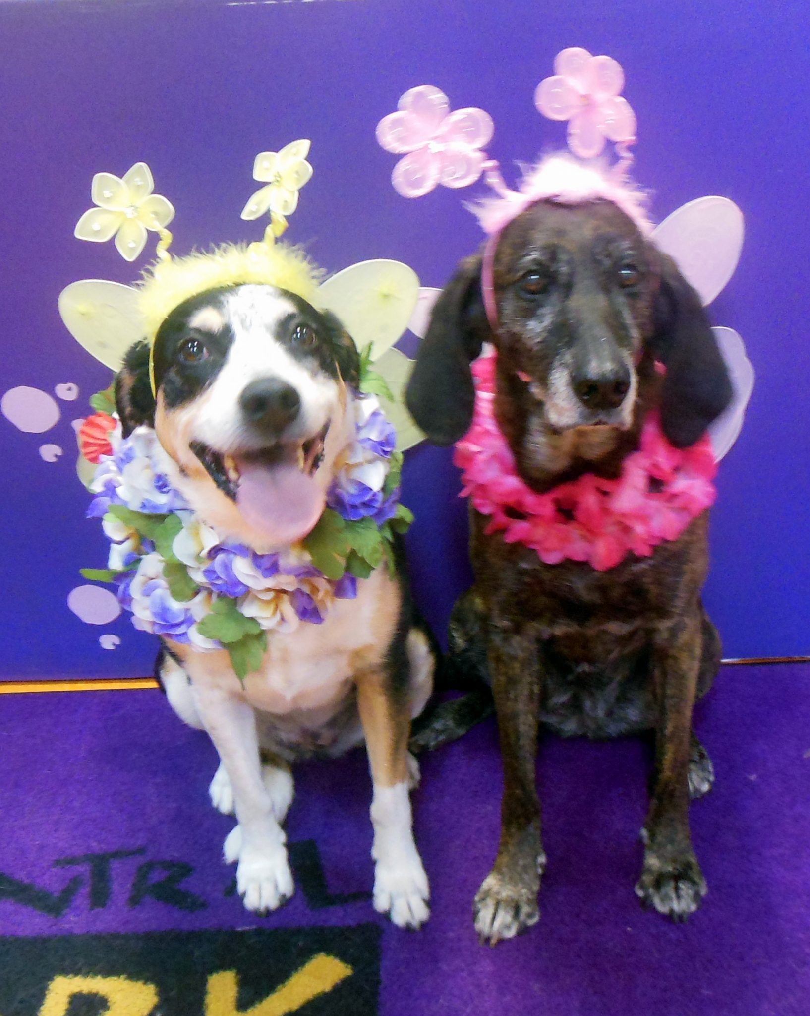 Sisters, Penny and Petula would like to usher in sunshine and spring flowers as our May Dogs of the Month. Penny, a 9 year old Border Collie Mix, announces their arrival every Wednesday morning. Her sister Petula, the quiet one, is a 12 year old Plothound. Petula is selective about who she plays with, and truth be told, her favorite thing to do is bask in the sunshine outside. Penny, on the other hand, will play with anyone who is willing. Penny especially likes to play with her sister and Hinakega, a German Shepherd friend. We have been lucky to have these two sweet girls bring sunshine and happiness to our days since 2010. Enjoy the spotlight girls. It is your time to shine!