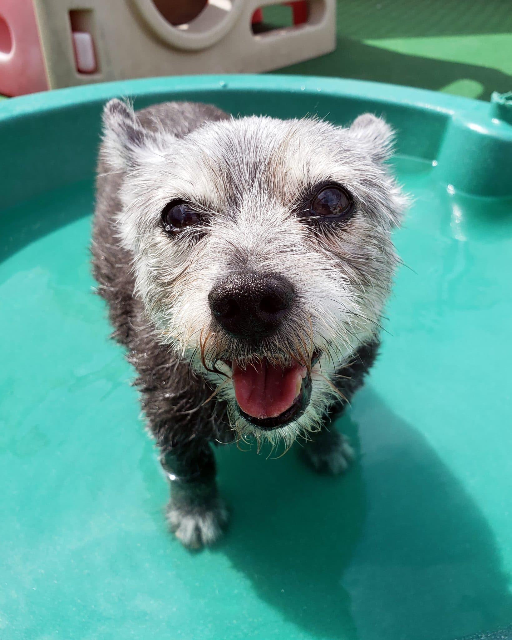 Mitzi is a 15 year old westie mix who just loves to come to day care! Mitzi has been coming to Central Bark Sheboygan Daycare for over ten years now! The handlers’ faces all light up when Mitzi comes through the door. Don’t let her age fool you… When it’s time to play Mitzi darts down the run looking for all of her friends. She gets most excited to see her pals Murphy B., a cute shih tzu mix, Heidi F., a beautiful terrier mix, and Cooper P., a young Pomeranian that just can’t get enough of our girl, Mitzi. On nice, hot, summer days like these you will most likely find Mitzi splashing around in her favorite pool to stay cool. When she’s done in her pool she strolls over to her handler for some much enjoyed cuddles and love.