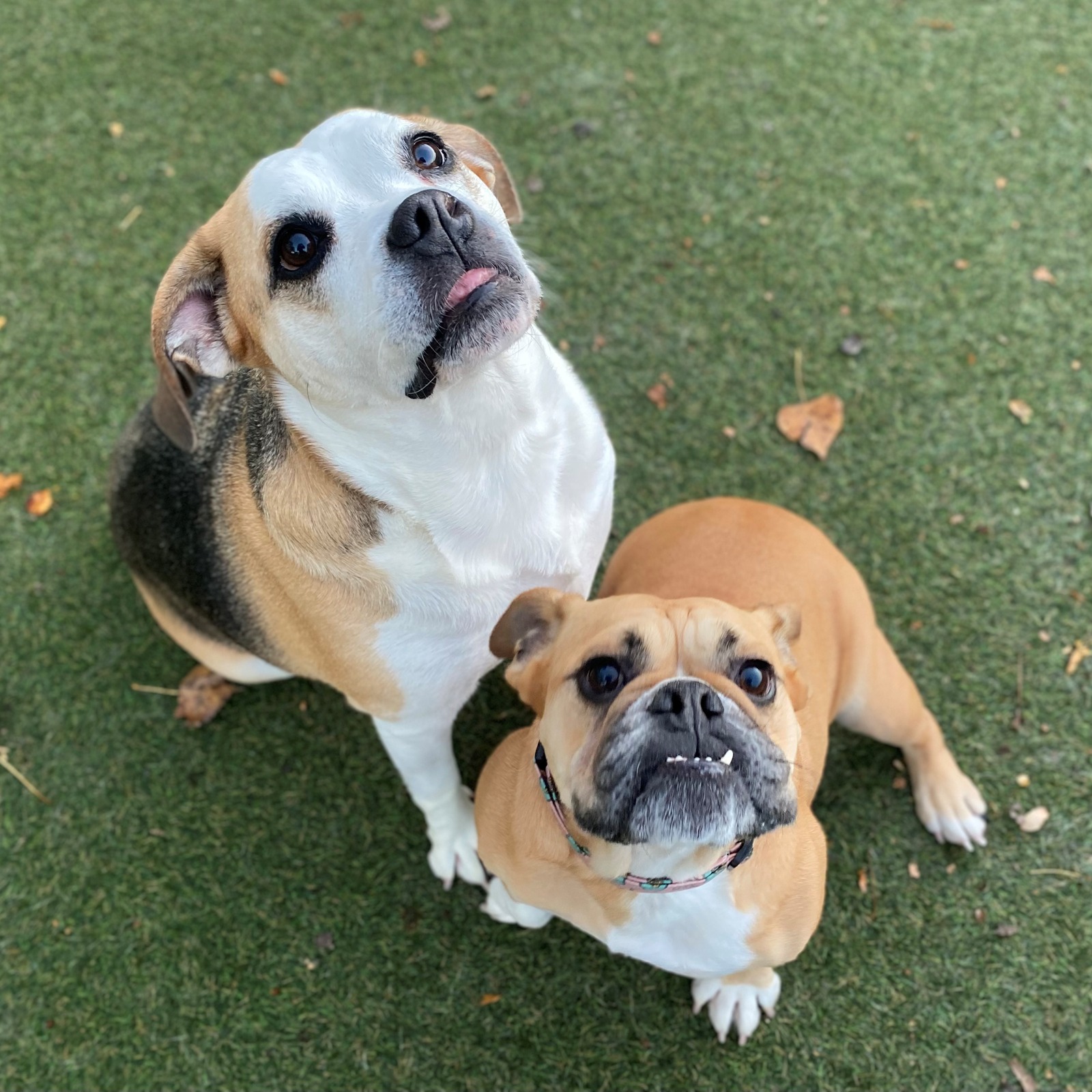 Roe and Lola were both adopted from Woof Gang Rescue. Roe is a 5-year-old Beagle mix. She joined the Central Bark family in the Spring of 2018, and we were fortunate to host her and her littermates for a reunion and their first birthday celebration! Roe is a very social gal and makes friends, both canine and human, quickly. Fast forward a year later, Roe’s family adopted a sweet sister for Roe, Miss Lola! Lola is a 5-year-old English bulldog. They love trotting through our front doors for a day of play every Monday. Roe and Lola both enjoy chasing their friends through, under, on and over the different play equipment. Roe and Lola often take a trip to the grooming spa to be freshened up during their stay and come out looking extra cute and sassy! As you’ll notice in their pictures, Roe and Lola are very photogenic and masters at the group sits.