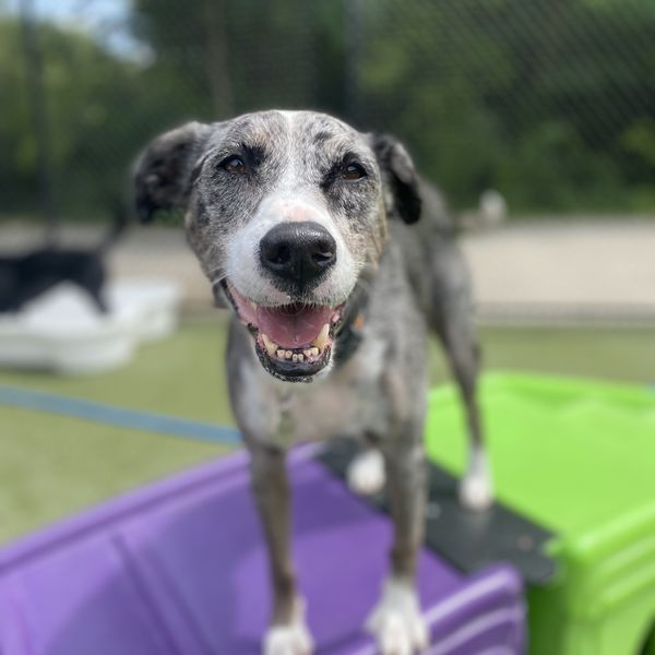 Claire is a 2 year old mixed breed. Claire first joined our family in July of 2021, shortly after being adopted by her Mom, Gillian. Since the moment Claire pranced through our doors, she has loved daycare and boarding with us. She attends enrichment daycare a few days a week and enjoys every second of it! She loves to hang out as close to our handlers as she can and get snuggles or you can find her sun bathing or scratching an itch along the fence! Claire loves food so she will gobble up anything you offer! A few of Claire’s friends are: Susan, Magnum, Marlin, and Zelda. Congratulations Claire, we enjoy spending our days with you and your furry friends!
