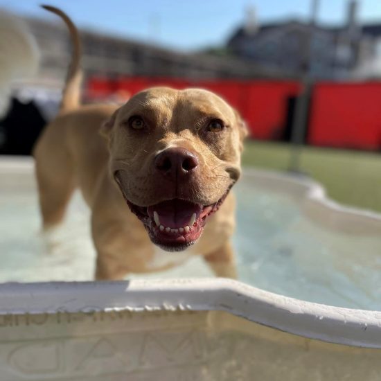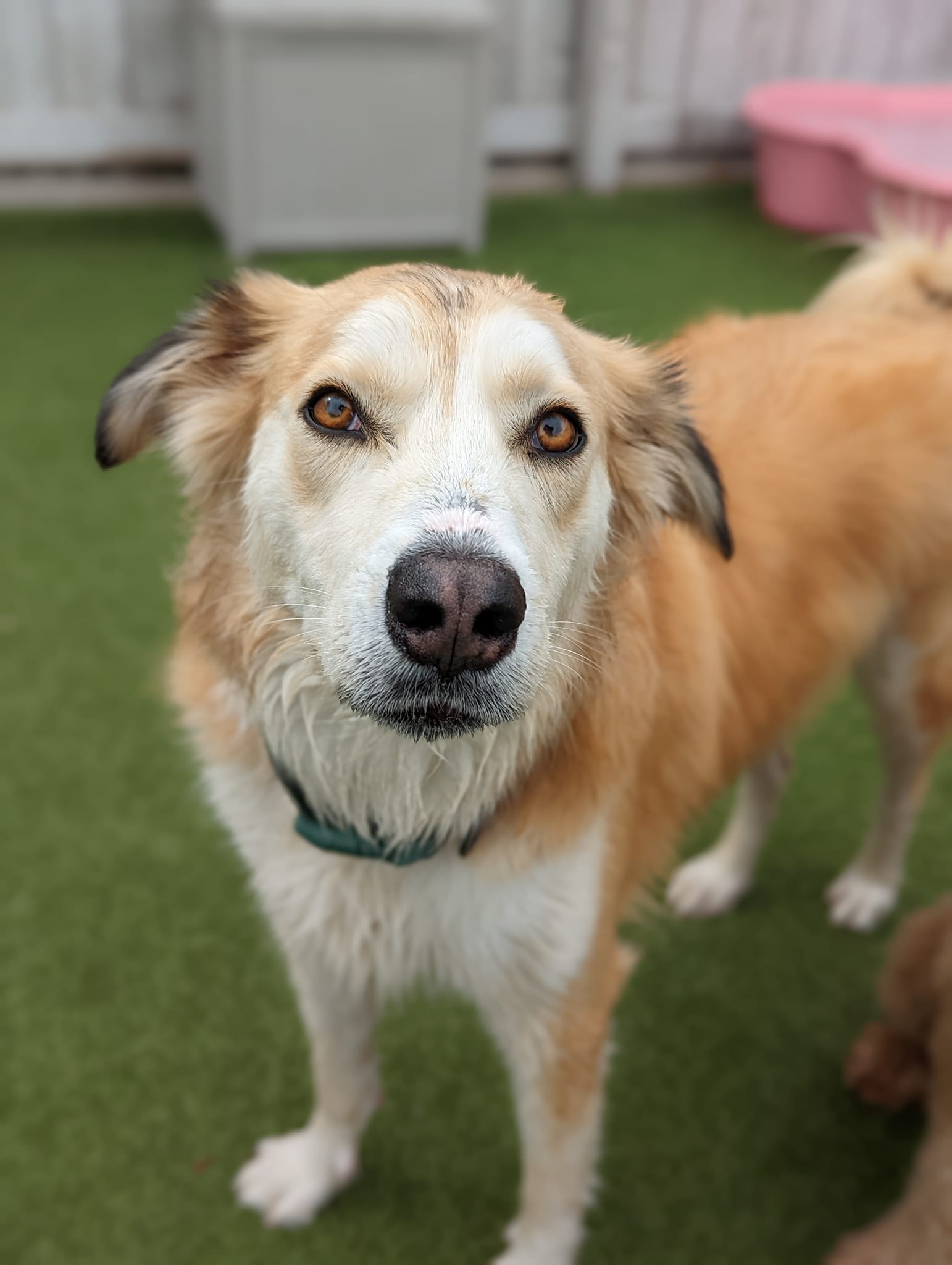 Before we knew it, he was walking into the building with a big smile on his face and was eager to go out back to play with his yellow group friends! While Walt is shy with new team members, he is a laid back and social guy with his dog pals Lola W., Reagan and Clarke! He is easily won over with cookies and head scratches from the Enrichment Specialists.
